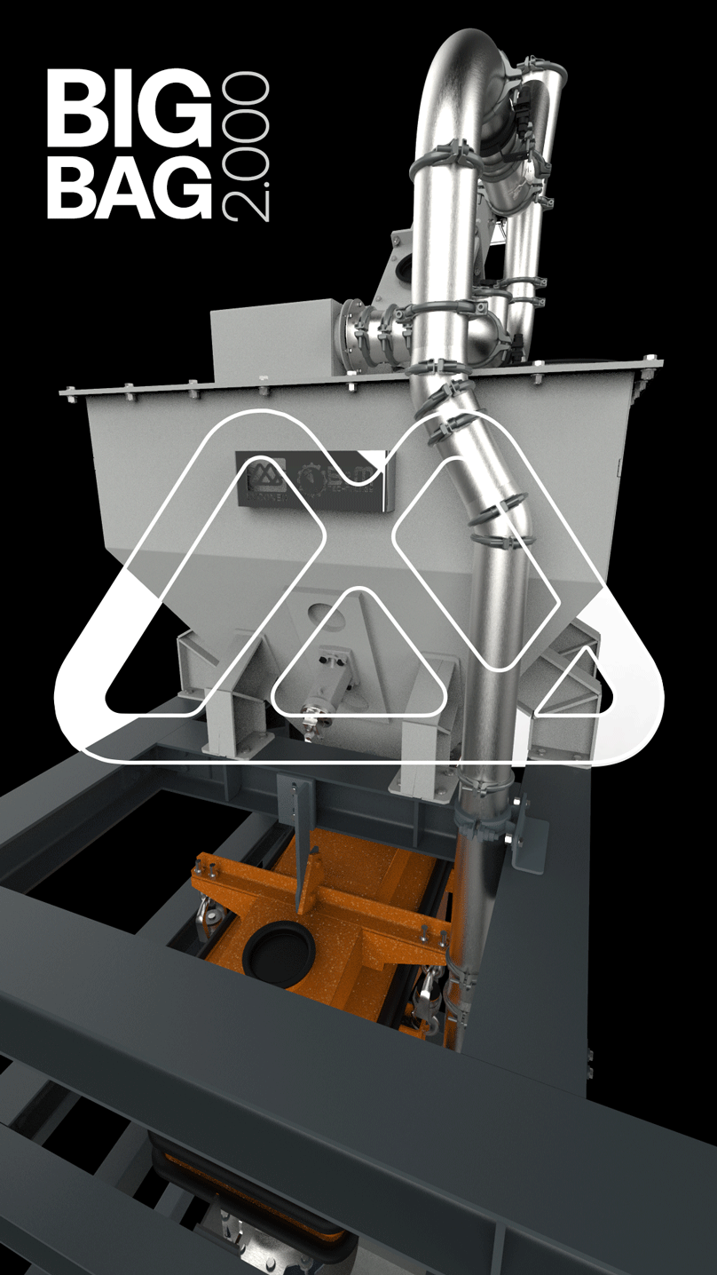 BIG-BAG Abfuellstation mit einem Vorbunkervolumen von 800 Liter und einer Bauhoehe von 5.560 mm zur Befuellung von 2 Tonnen BIG-BAGs.